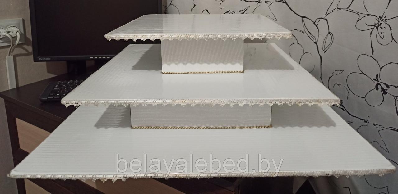 Подставка на 3 яруса, квадратная, большого размера, вместительная и универсальная, белого цвета из очень плотного глянцевого картона (поверхность легко протирается влажной салфеткой). Устойчивая конструкция с широкой квадратной опорой между ярусами. Форма пирамиды: нижний ярус 61 на 61 см (ширина полочек по бокам, с каждой из четырёх сторон по 15,5 см); средний 48 см на 48 см, по бокам по 15 см; верхний 35 см на 35 см, диагональ верхнего яруса 49 см; высота между ярусами по 10 см.